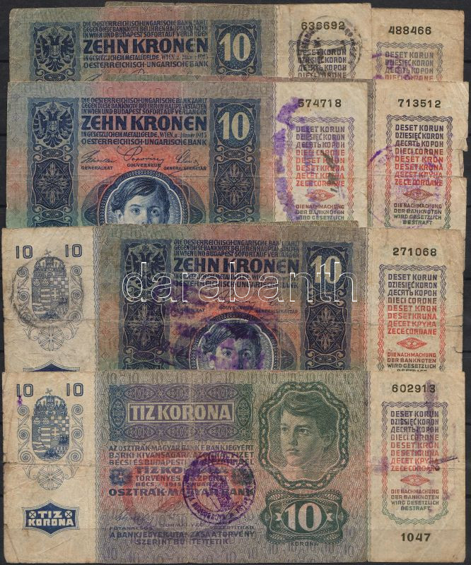 Leírás: 1919 10K (8x), 50K, 100K(2x) román, jugoszláv és helyi kézibélyegzőkkel 11db klf. T:II,III,IV