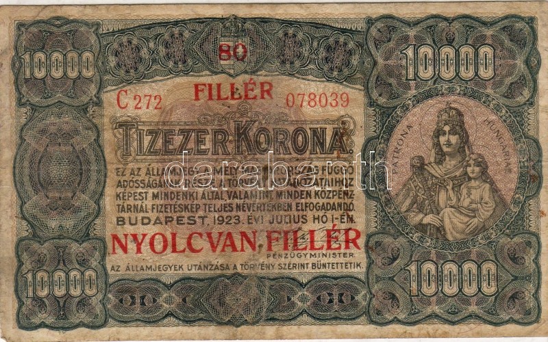 1925 10000K 80f felülnyomással T:II/III R! https://www.darabanth.com/hu/2-Nagyaukcio/2.1/Numizmatika/Magyar-es-kulfoldi-bankjegyek-Ungarische-und-auslandische-Banknoten~523/1925-10000K-80f-felulnyomassal-TIIIII-R~II40321