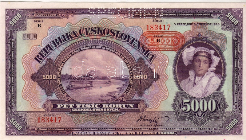 Leírás: D.Reich/Cseh-Morva Protektorátus/Böhmen u. Mähren 1943 cseh/tschechische 5000K piros felülnyomással/rote Überdruck "Specimen" lyukasztással/mit Lochung T:I RR!!