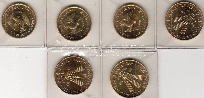 1947-48-50 10f + 20f "citromsárga" teljes sor 6db utánveret T:BU RRR!!... https://www.darabanth.com/hu/2-Nagyaukcio/2.1/Numizmatika/Magyar-fem-es-ezustpenzek-Ungarische-Metal-und-Silbermunzen~525/1947-48-50-10f-plus-20f-citromsarga-teljes-sor-6db-utanveret-TBU-RRR-Csak-2000db-letezhet~II41500