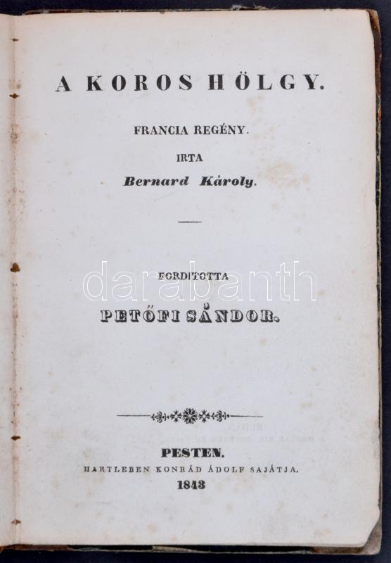 Bernard Károly [Charles de]: A koros hölgy. Ford.: Petőfi Sándor. Pest, 1843, Kisfaludy Társaság (Külföldi regénytár 16.) Megviselt félbőr kötésben, egyébként jó állapotban. Petőfi Sándor legelső, önálló kötetben megjelent műfordítása, első kiadás!
