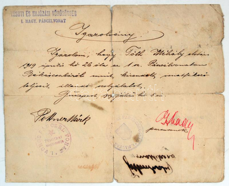 1919 Névre szóló igazolás az 1. sz. páncélvonaton vonatfékezÅ‘i szolgálat teljesÃtésérÅ‘l, az I. Magyar Páncélvonat parancsnoksága parancsnokának és Poltner Márk, az I. Vörös Páncélvonat politikai megbÃzottjának aláÃrásaival és bélyegzÅ‘ivel