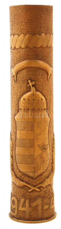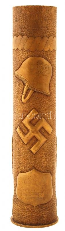 1941-1942 Emlék a keleti frontról, második világháborús Schneider ágyútöltény hüvelyből készült váza dombornyomott díszítéssel: a koronás magyar kiscímerrel, valamint rohamsisakkal, üres címerpajzzsal, és horogkereszttel, d: 8 cm, m: 38,5 cm /