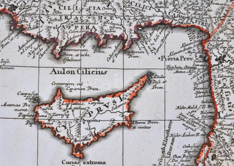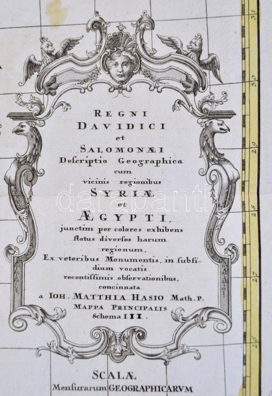 1739 Regni Davidici et Salomonaei descriptio geographica cum vicinis regionibus Syriae et Aegypti ... mappa principalis, schema III. Johann Matthias Haas (1684-1742) térképe a Közel-Keletről és Egyiptomról, Nürnberg, Officina Homanniana. Rézmetszet, papír, 46×31,5 cm /