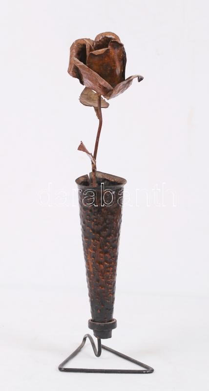 Leírás: Vörösréz rózsa vázában, m: 36 cm.