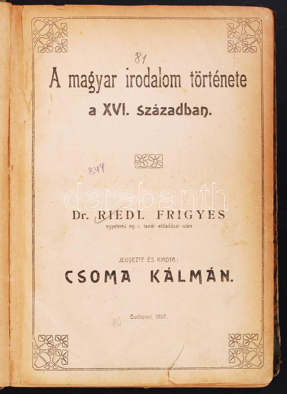 Leírás: Csoma Kálmán: A magyar irodalom története a XVI. században Riedl Frigyes előadásai után. Bp., 1907 szerzői 430p. kissé megviselt félvászon kötésben