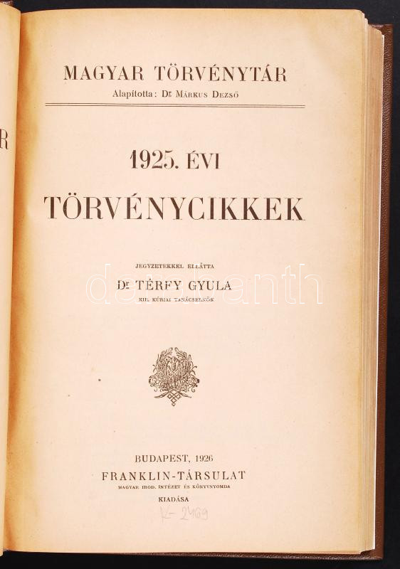 Magyar Törvénytár. Corpus Juris Hungarici. 1925. évi törvényczikkek. Jegyzetekkel ellátta Dr. Térfy Gyula kir. kúriai tanácselnök. Bp., 1897, Franklin. Újrakötött, műbőr kötés.