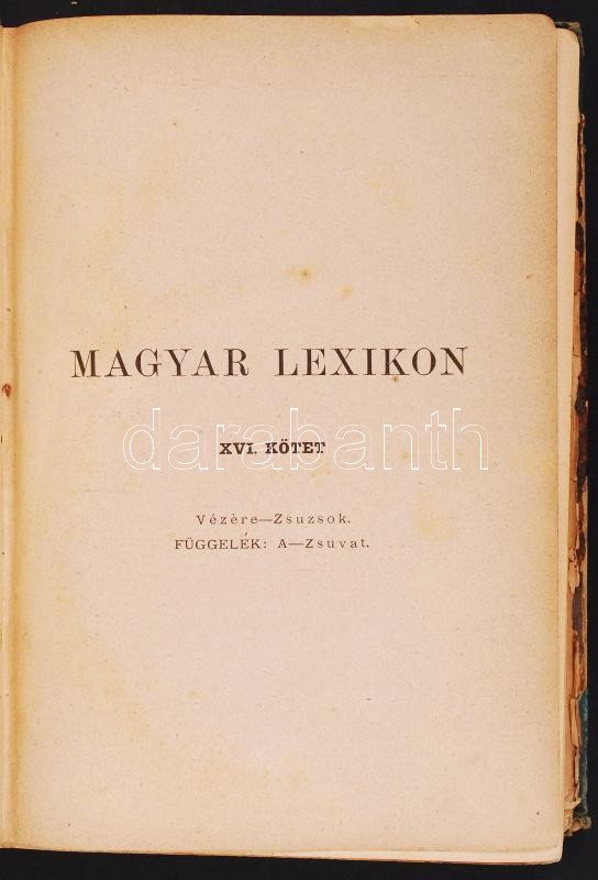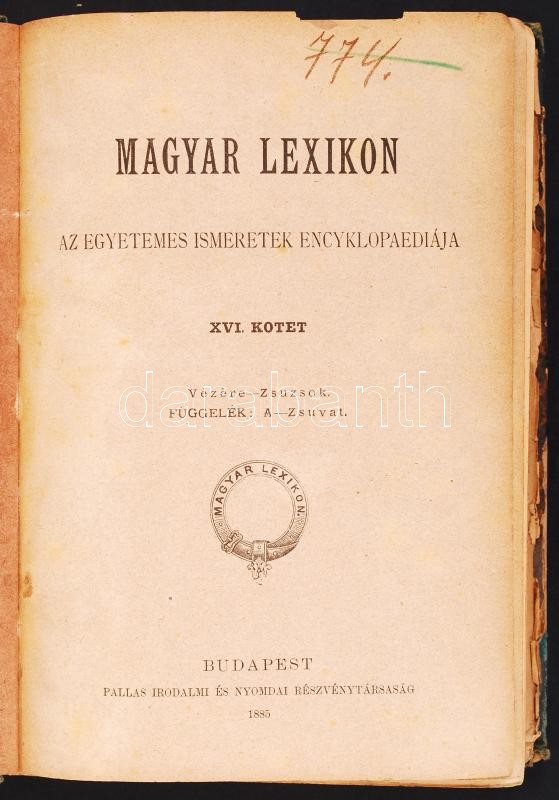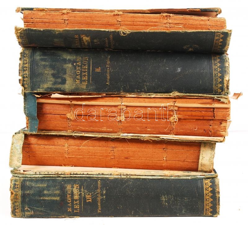 Magyar lexikon. Az összes tudományok encziklopédiája 15 kötet a sorozatból. Szerk. Somogyi Ede. Bp. 1879-1884. Rautmann - Wilckens (Pallas). 3 kötet teljesen szétesett állapotban, de sok kötet gerince elvált, lapok sérültek