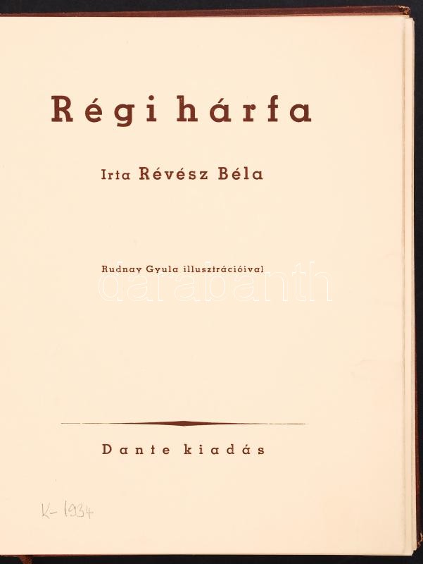Révész Béla: Régi hárfa. Rudnay Gyula illusztrációival. Bp., 1937, Dan... https://www.darabanth.com/hu/200-Gyorsarveres/200.0/Festmeny-mutargy-papirregiseg-egyeb/Konyvek-Egyeb-ritkasagok~200026/Revesz-Bela-Regi-harfa-Rudnay-Gyula-illusztracioival-Bp-1937-Dante-Kartonalt-gerince~II782661