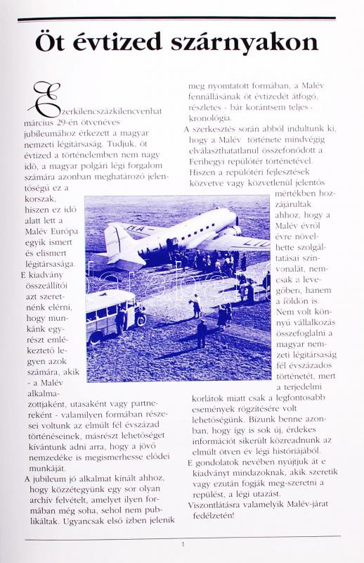 Öt évtized szárnyakon (50 years). Budapest, 1996, A MALÉV története, s... https://www.darabanth.com/hu/200-Gyorsarveres/200.0/Festmeny-mutargy-papirregiseg-egyeb/Konyvek-Tortenelem~200011/Ot-evtized-szarnyakon-50-years-Budapest-1996-A-MALEV-tortenete-szines-fotokkal-illuszt~II765519