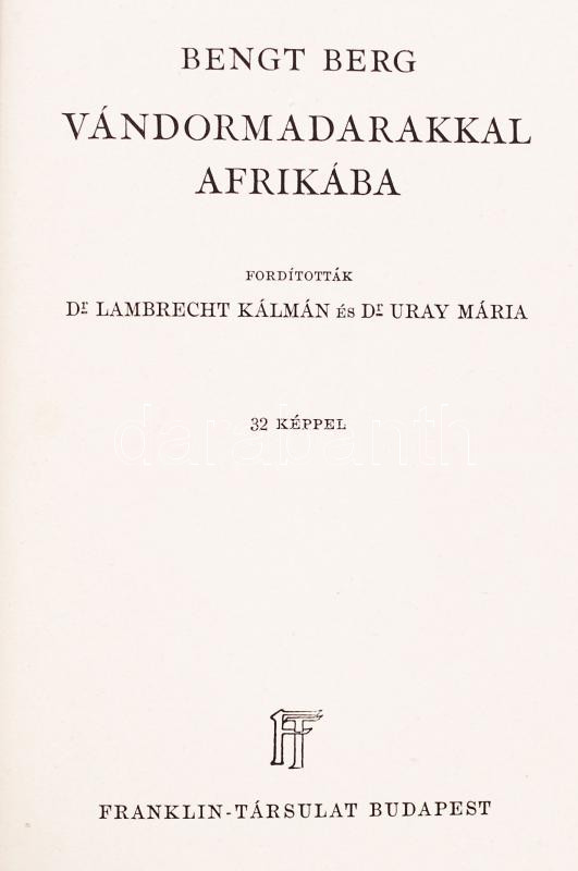 Világjárók Utazások és kalandok: Berg, Bengt Vándormadarakkal Afrikába... https://www.darabanth.com/hu/200-Gyorsarveres/200.0/Festmeny-mutargy-papirregiseg-egyeb/Konyvek-Utazas-varosok~200013/Vilagjarok-Utazasok-es-kalandok-Berg-Bengt-Vandormadarakkal-Afrikaba-Ford-Lambrecht-KalmC3~II754399