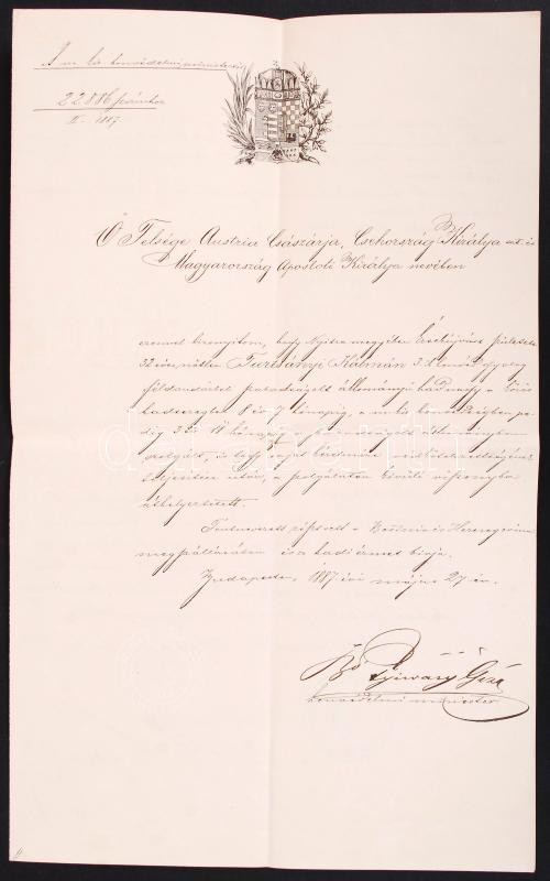 1887 Bp., Szolgálaton kívülre szóló helyezésről szóló okmány Turcsányi... https://www.darabanth.com/hu/200-Gyorsarveres/200.0/Festmeny-mutargy-papirregiseg-egyeb/Militaria~200006/1887-Bp-Szolgalaton-kivulre-szolo-helyezesrol-szolo-okmany-Turcsanyi-Kalman-reszere~II784189