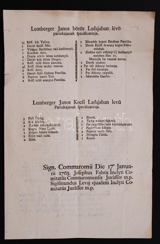 1762-1763 Ellopott tárgyakról összeállított lista magyar és latin nyel... https://www.darabanth.com/hu/200-Gyorsarveres/200.0/Festmeny-mutargy-papirregiseg-egyeb/Nyomtatvanyok~200009/1762-1763-Ellopott-targyakrol-osszeallitott-lista-magyar-es-latin-nyelven-vizjeles-papiron-~II766130