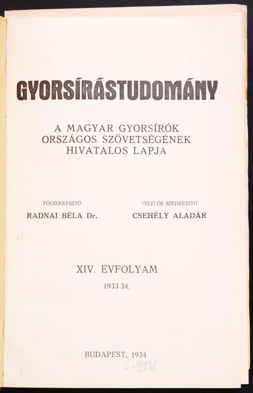 Leírás: 1933-1934 Bp., Gyorsírástudomány. A Magyar Gyorsírók Országos Szövetségének hivatalos lapja, XIV. évfolyam.