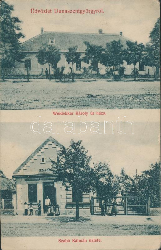 Dunaszentgyörgy, Weidekker Károly háza, Szabó Kálmán üzlete (EK) https://www.darabanth.com/hu/200-Gyorsarveres/200.0/Kepeslapok/Magyarorszag~600005/Dunaszentgyorgy-Weidekker-Karoly-haza-Szabo-Kalman-uzlete-EK~II788719