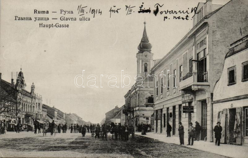 Ruma, main street, church, market https://www.darabanth.com/hu/200-Gyorsarveres/200.0/Kepeslapok/Vajdasag~600010/Ruma-main-street-church-market~II716677