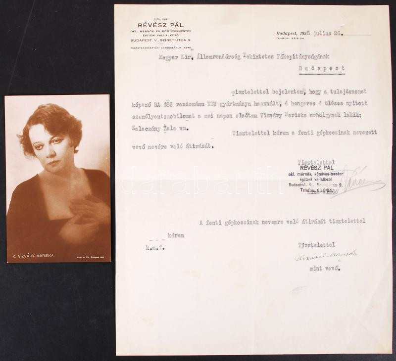 Leírás: 1935 Bp., Vízváry Mariska színművésznő aláírása rendőrségi bejelentőlapon,és egy, a színésznőt ábrázoló képeslap