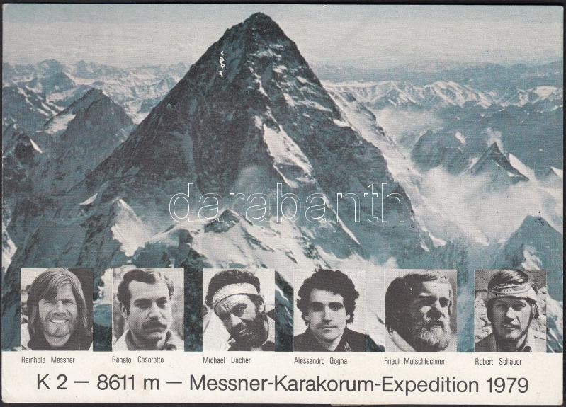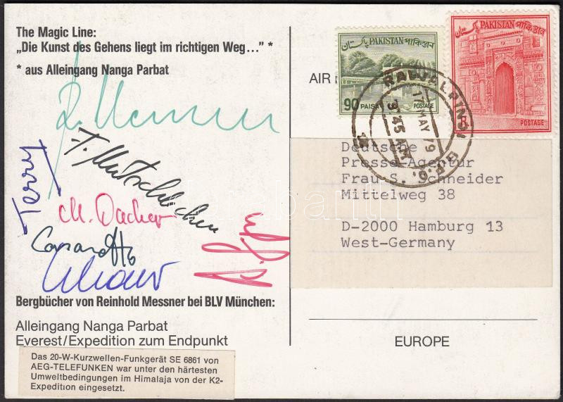 Leírás: 1979 Pakisztán Reinhold Messner hegymászó K2 expedíciójáról írt levelezőlap valamennyi hegymászó így Messner aláírásával. Unikum!