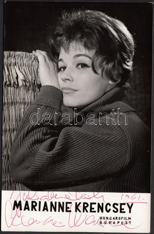 Leírás: Krencsey Marianne (1931-) magyar színésznő saját kezű aláírása az őt ábrázoló fotón.