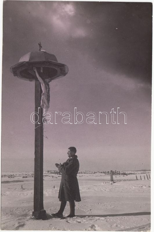 Leírás: 1914-1918 Kerny István (1879-1963): Hálaadó ima a harc után, vintage katonai fotó, pecséttel jelzett, 17x11 cm