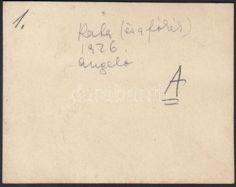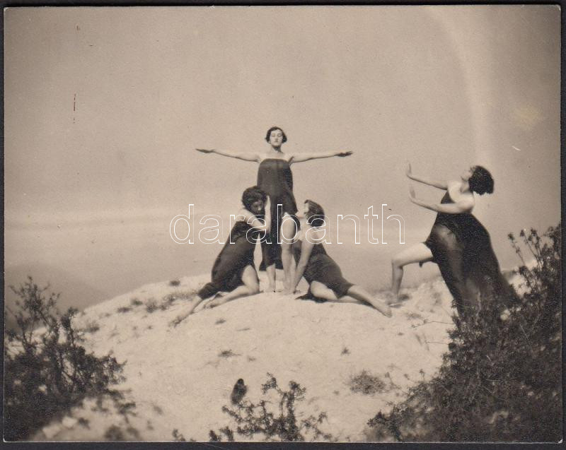 1926 Angelo: Kata és a fókák, vintage fotó Szentpál Olga mozgásművészeti iskolájának növendékeiről, jelzetlen, feliratozott, Szentpál Olga hagyatékából, 7x9 cm