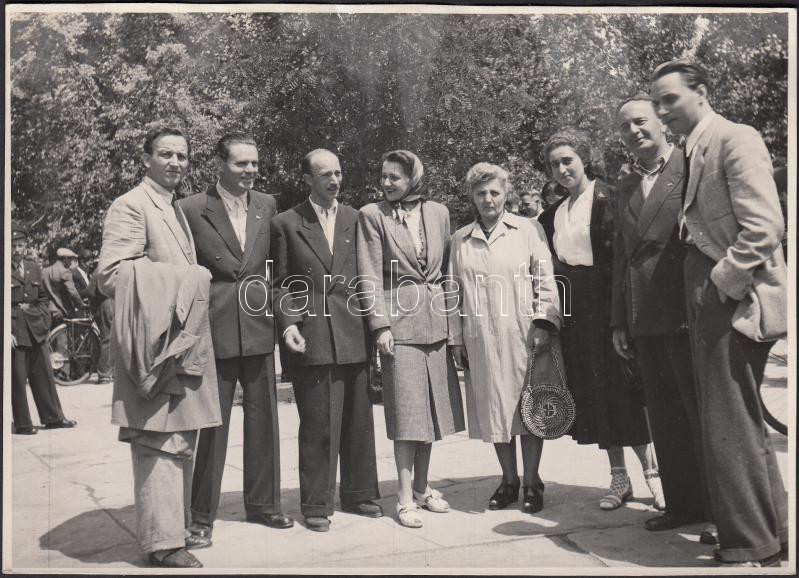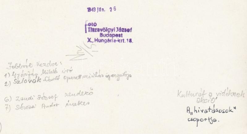 1949 Tiszavölgyi József: Kultúrát a vidéknek turnén, jobbról: Gyárfás Miklós író, Szlovák László az Operett színház igazgatója, stb, feliratozva, szocreál propagandakép, 12x17 cm