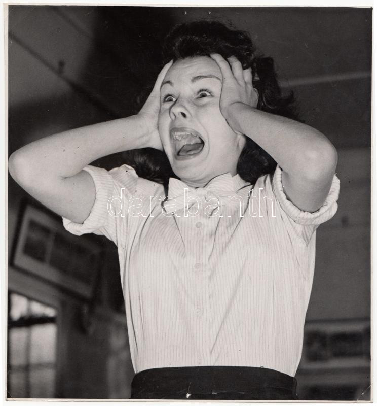 Leírás: cca 1950-1960 Jean Simmons angol színésznő rémületben, filmfotó, feliratozva, 21x20 cm
