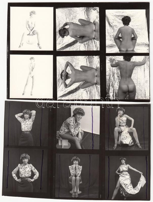 cca 1970-1980 Erotikus fotómodell műtermi beavatásáról készült fotósorozat, kontakt másolatban, 16 db 6x6 cm-es nézőkép, 3 db 13x18 cm-es fotópapírra másolva /