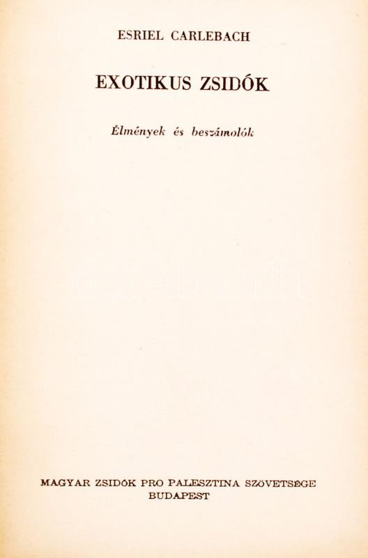 Carlebach, Esriel: Exotikus zsidók. ÉLmények és beszámolók. Bp., Magyar Zsidók Pro Palesztia Szövetsége. A fordítótól Dr. Vidor Pálnak ajánlva, kartonált.