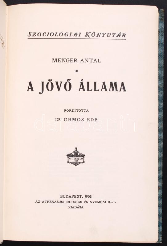 Menger Antal: A jövő állama. Szociológiai Könyvtár, Fordította: Dr. Or... https://www.darabanth.com/hu/201-Gyorsarveres/201.0/Festmeny-mutargy-papirregiseg-egyeb/Konyvek-Tudomany~200029/Menger-Antal-A-jovo-allama-Szociologiai-Konyvtar-Forditotta-Dr-Ormos-Ede-Bp-1908-Ath~II769370