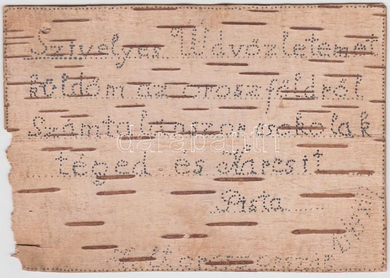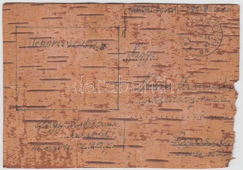 1945 Tábori postai nyírfakéreg levelezőlap Oroszországból Magyarország... https://www.darabanth.com/hu/201-Gyorsarveres/201.0/Festmeny-mutargy-papirregiseg-egyeb/Parafilatelia~200022/1945-Tabori-postai-nyirfakereg-levelezolap-Oroszorszagbol-Magyarorszagra~II796442