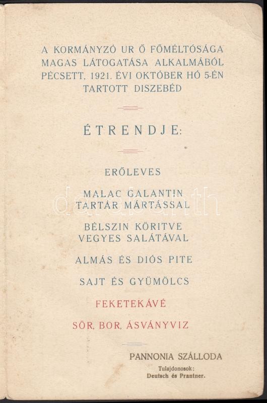 1921 Pécs Pannónia szálloda: A kormányzó látogatása alkalmából tartot... https://www.darabanth.com/hu/201-Gyorsarveres/201.0/Festmeny-mutargy-papirregiseg-egyeb/Tortenelmi-dokumentumok-keziratok-erdekessegek~200028/1921-Pecs-Pannonia-szalloda-A-kormanyzo-latogatasa-alkalmabol-tartott-diszebed-menuka~II798197