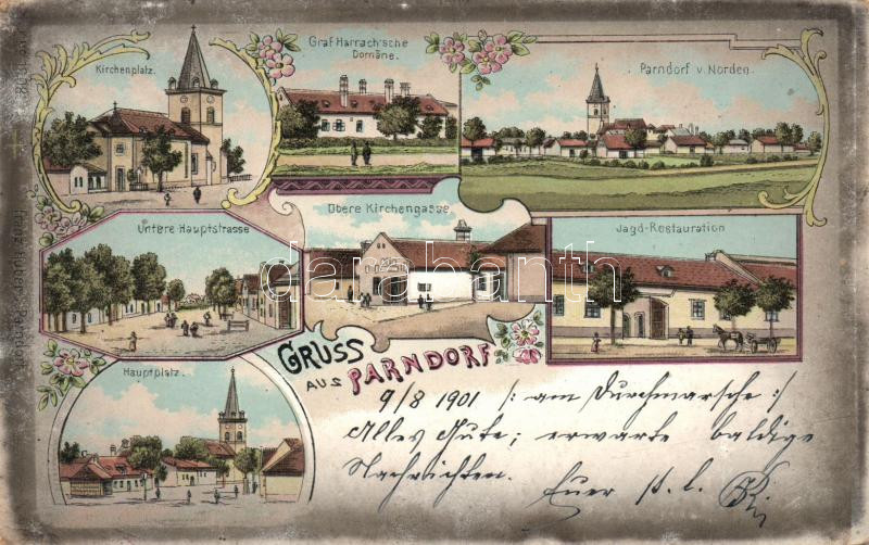 Leírás: Pándorfalu, Parndorf; church, main square, restaurant, floral, litho (EK)