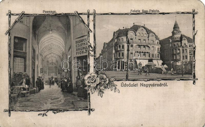 Leírás: Nagyvárad Passage, budapesti csipkeáruház fiókja, Fekete Sas Palota; Wagner Vilmos kiadása / lace store, palace, floral (r)