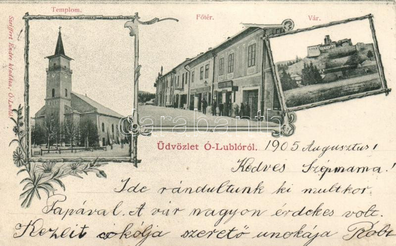 Leírás: Ólubló templom, Fő tér Szeiffert Endre üzletével, vár; Szeiffert Endre kiadása / church, main square with shop, castle, floral