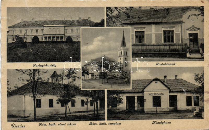 Leírás: Újszász, Parlagi kastély, Postahivatal, Római katolikus elemi iskola és templom, községháza (fa)