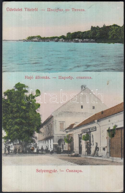 Leírás: Titel hajóállomás, selyemgyár, Szvoboda Rezső üzlete / ship station, silk mill, shop (fl)