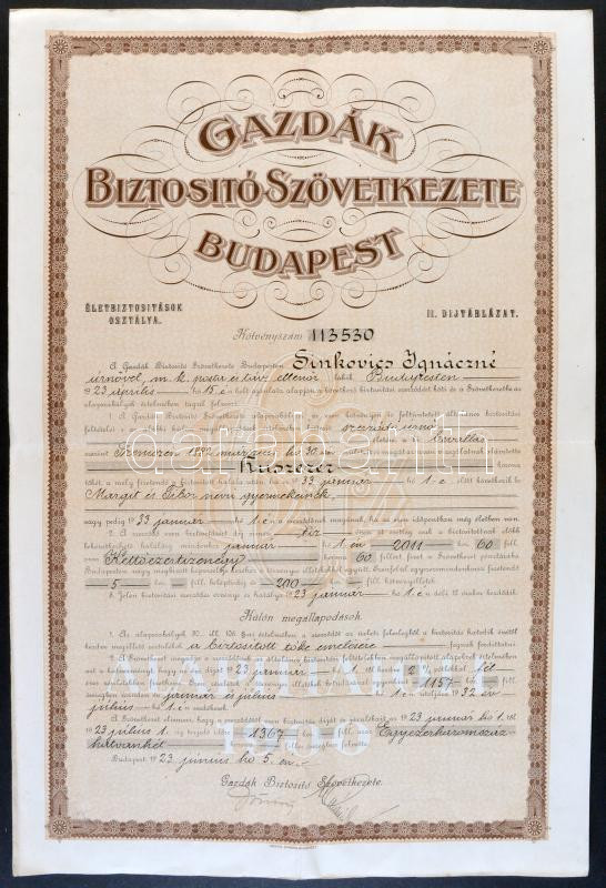 Leírás: 1923. "Gazdák Biztosító Szövetkezete Budapest életbiztosítási kötvény T:III