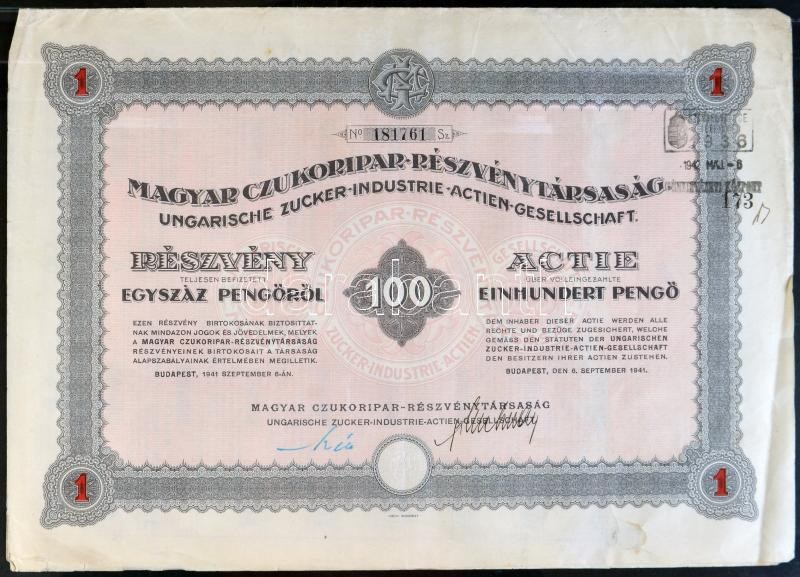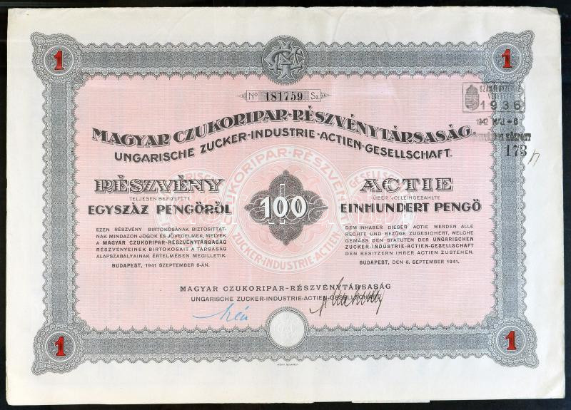 Leírás: Budapest 1941. "Magyar Czukoripar-Részvénytársaság" 5 részvénye egyenként 100P-ről szelvényekkel (2x) T:II-