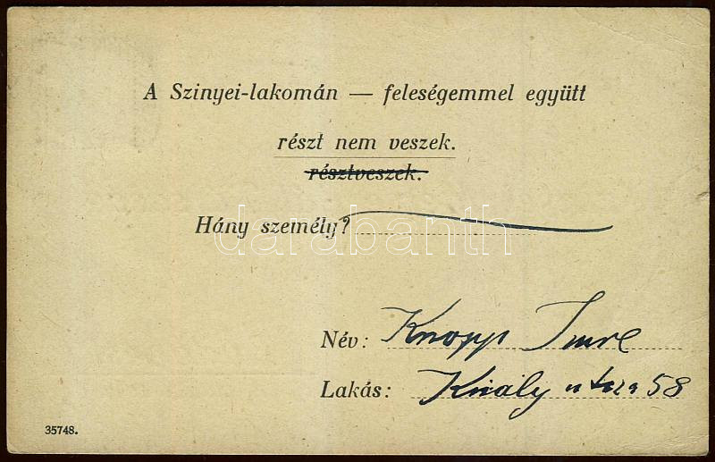 Leírás: 1926 Knopp Imre festőművész aláírása a Színyei Társaság meghívóján