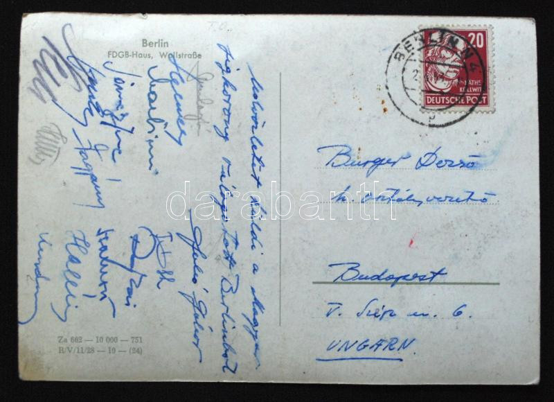 Leírás: 1959 Magyar jégkorong-válogatott tagjai által küldött képeslap a játékosok aláírásaival Berlinből.