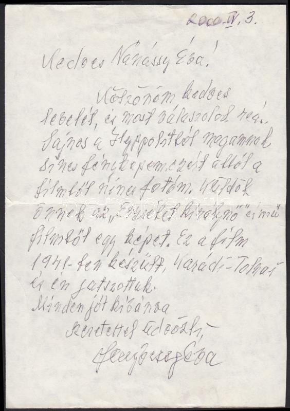 Leírás: Fenyvessy Éva (1911-2009) színásznő saját kézzel írt levele egy rajongójának