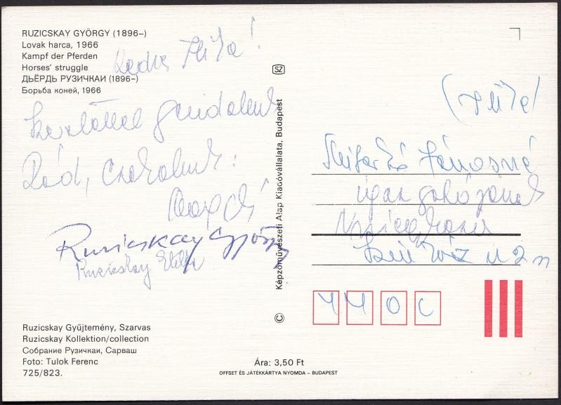 Leírás: Ruzicskay György (1896-1993) festőművész aláírása saját festményét ábrázoló képeslapon