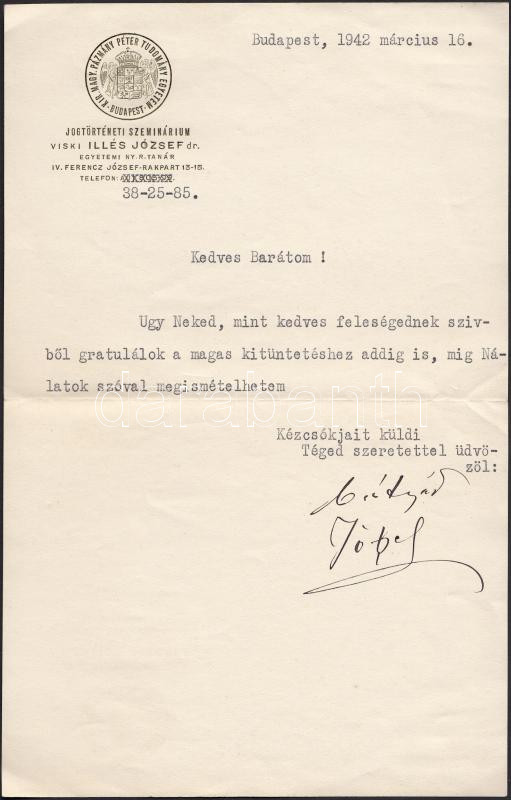 Leírás: dr. Viski Illés József (1871-1944) jogtörténész, egyetemi tanár, az MTA tagja aláírása a Királyi Magyar Pázmány Péter Egyetem fejléces levélpapírján