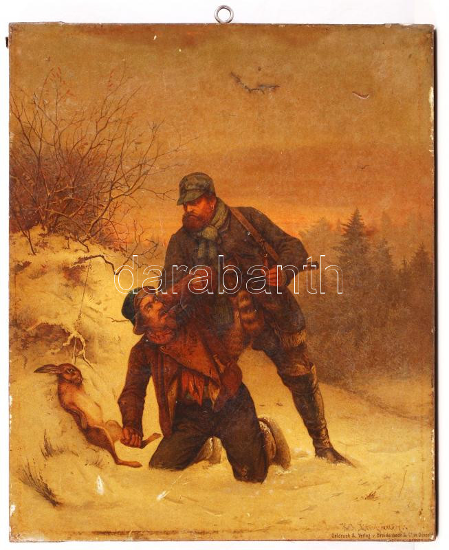 Leírás: A megfogott vadorzó, vadászjelenet. Olajnyomat vászonra kasírozva, 27x33 cm