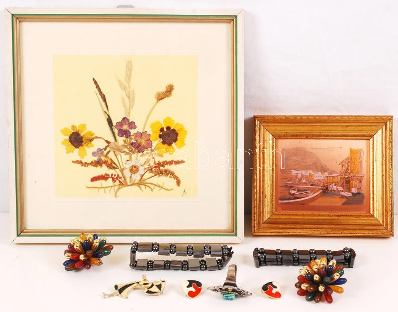 Vegyes bolha tétel: 2 db fekete mágneses karkötő, ékszerek (bizsu fülbevaló-2 pár, szkarabeusz bogaras gyűrű, esernyős hölgy-kitűző), 2 kép (szárított virágok-21x21 cm, kikötő-13x11 cm)