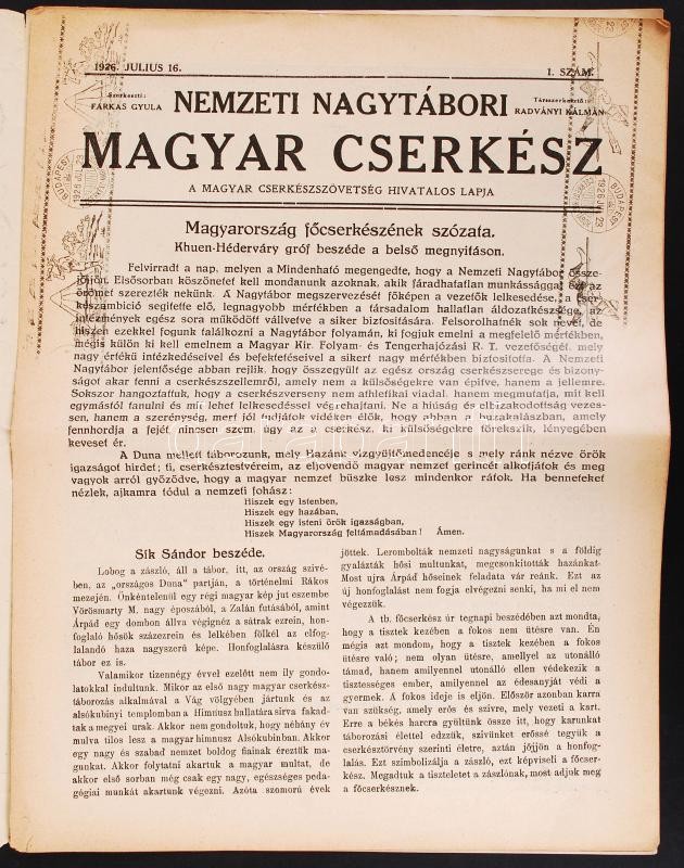 1926 Nemzeti nagytábori Magyar Cserkész 1. szám https://www.darabanth.com/hu/202-Gyorsarveres/202.0/Festmeny-mutargy-papirregiseg-egyeb/Cserkesz~200002/1926-Nemzeti-nagytabori-Magyar-Cserkesz-1-szam~II804144