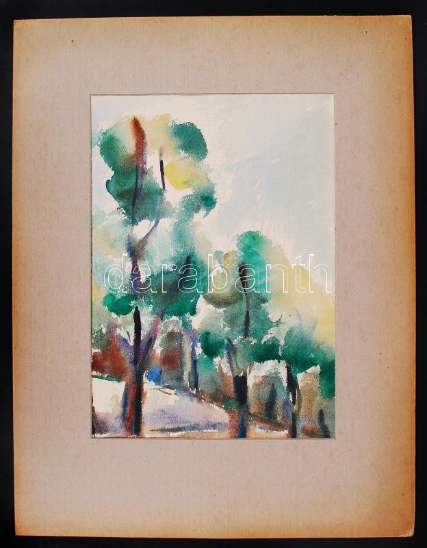 Leírás: Blahos Rudolf (1917-1986): Fák az útnál, akvarell, papír, jelzett, paszpartuban, 35×22 cm