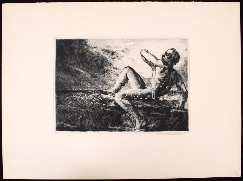 Leírás: Komjáti-Wanyerka Gyula (1894-1958): Férfi a viharban. Rézkarc, papír, jelzett, 18×26 cm