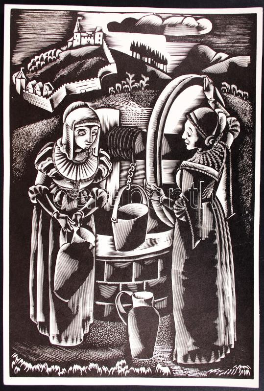 Leírás: Molnár C Pál (1894-1981): A kútnál. Fametszet, papír, jelzés nélkül, 30×20 cm